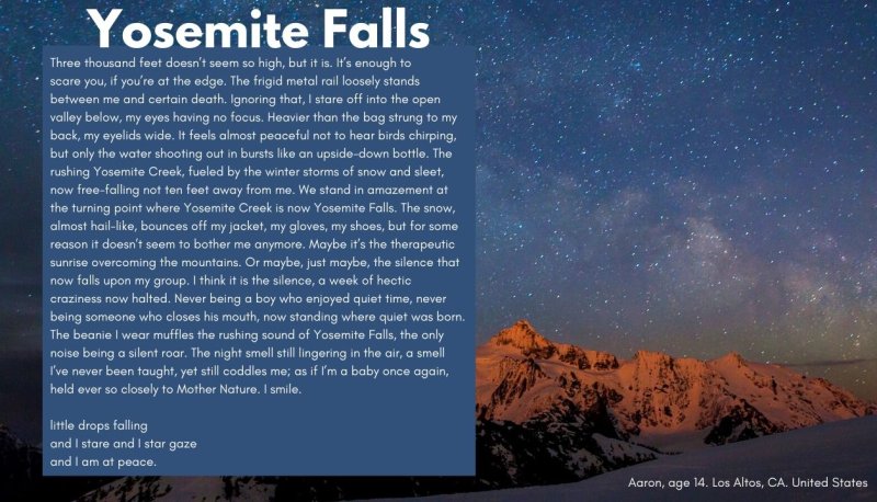 River of Words Spotlights highlight students whose art or poetry has been selected for publication in the River of Words Anthology, as well as teachers who have received or been nominated for the River of Words / Kalmanovitz School of Education Teacher of the Year Award.