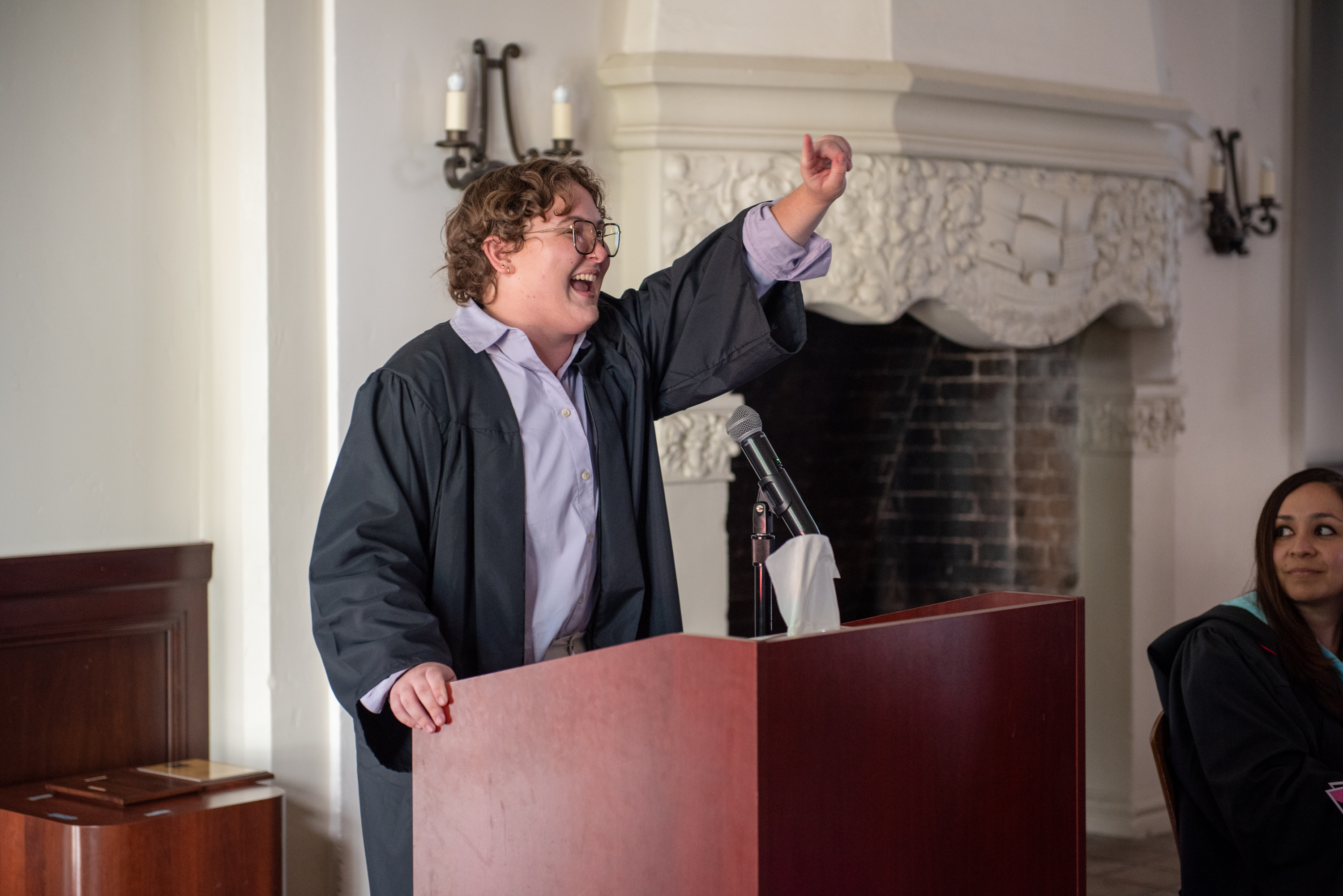 A space of pride: Lou Cooper ’24, keynote speaker at this year’s Lavender Graduate Celebration in De La Salle Hall, says they found “my people” at Saint Mary’s. “The love and camaraderie and support will be what I take away from being here.” / Photo by Ashley Rose