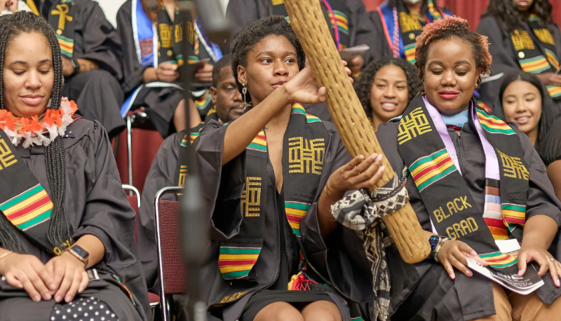 SMC alumnus Lloyd Schine ’98, ME ’04, MA ’14, director of institutional advancement at Bay Scholars, presented graduates with their alumni pins. After the kente cloth presentation, graduates participated in the tradition of passing a rainstick, and recited the Ghanaian Adinkra phrase “Nea onnim no sua, a ohu,” meaning “One who does not know can know from learning.”