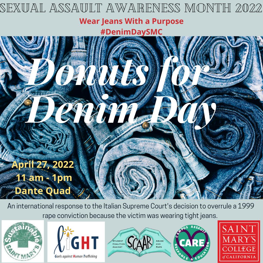 On Wednesday, the CARE Center, Student Coalition Against Abuse and Rape (SCAAR), Sustainability SMC, and Gaels LiGHT will partner to host Donuts For Denim Day and the Free Store Denim Table during Community Time. All interested in stopping by can come to Dante Quad for donuts and a look at the denim offerings from the Free Store. Wear your denim in support of survivors, post a photo with the hashtag #denimdaysmc, and you will be entered in a raffle for a $75 credit for a denim purchase of your choice.