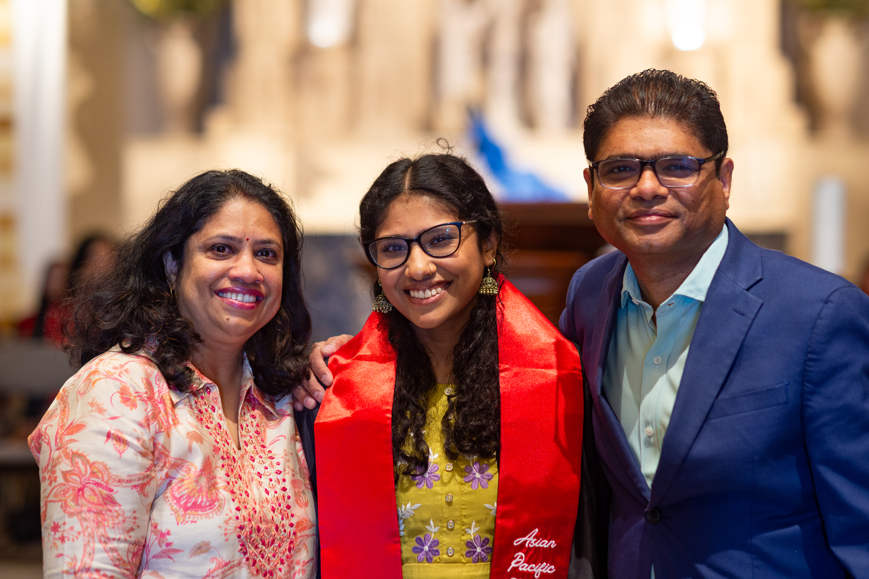 Plenty to be proud of: Tanisha Choudhary '25, Psychology major and former Publicity Manager for SMC's South Asian Society, poses with her parents at the 2025 Asian Pacific Islander Graduate Celebration. / Photo by Richard Trinth