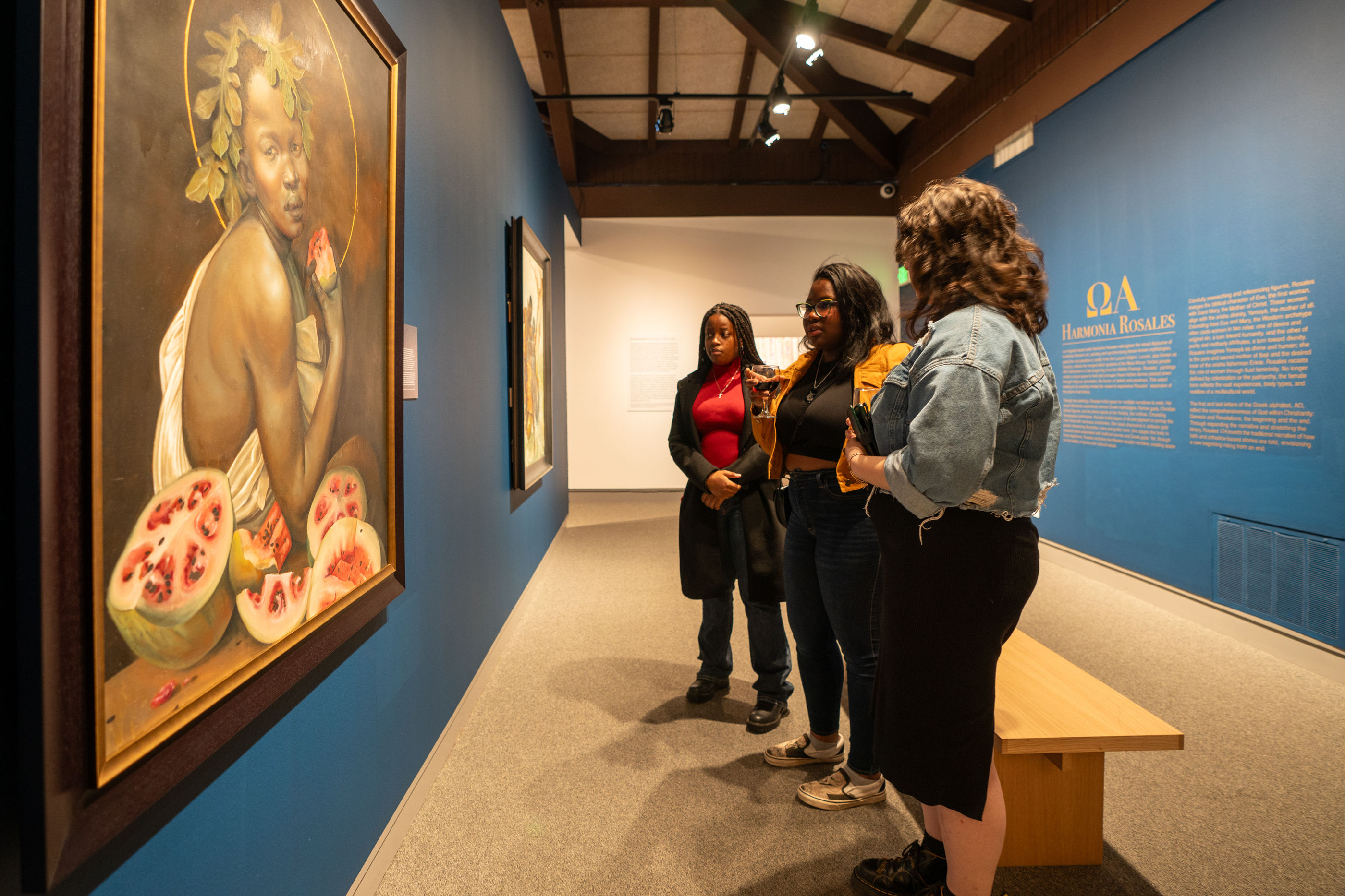 SMC’s Museum of Art visitors at the opening of “ΩA Omega Alpha,” the Northern California debut of Afro-Cuban artist Harmonia Rosales and paintings that reimagine Renaissance art. Exhibits like this are just one piece of the museum's evolution, says Lauren MacDonald. “We now recognize the need for climate mitigation strategies that help protect the museum building and its collections.” / Photo by Francis Tatem