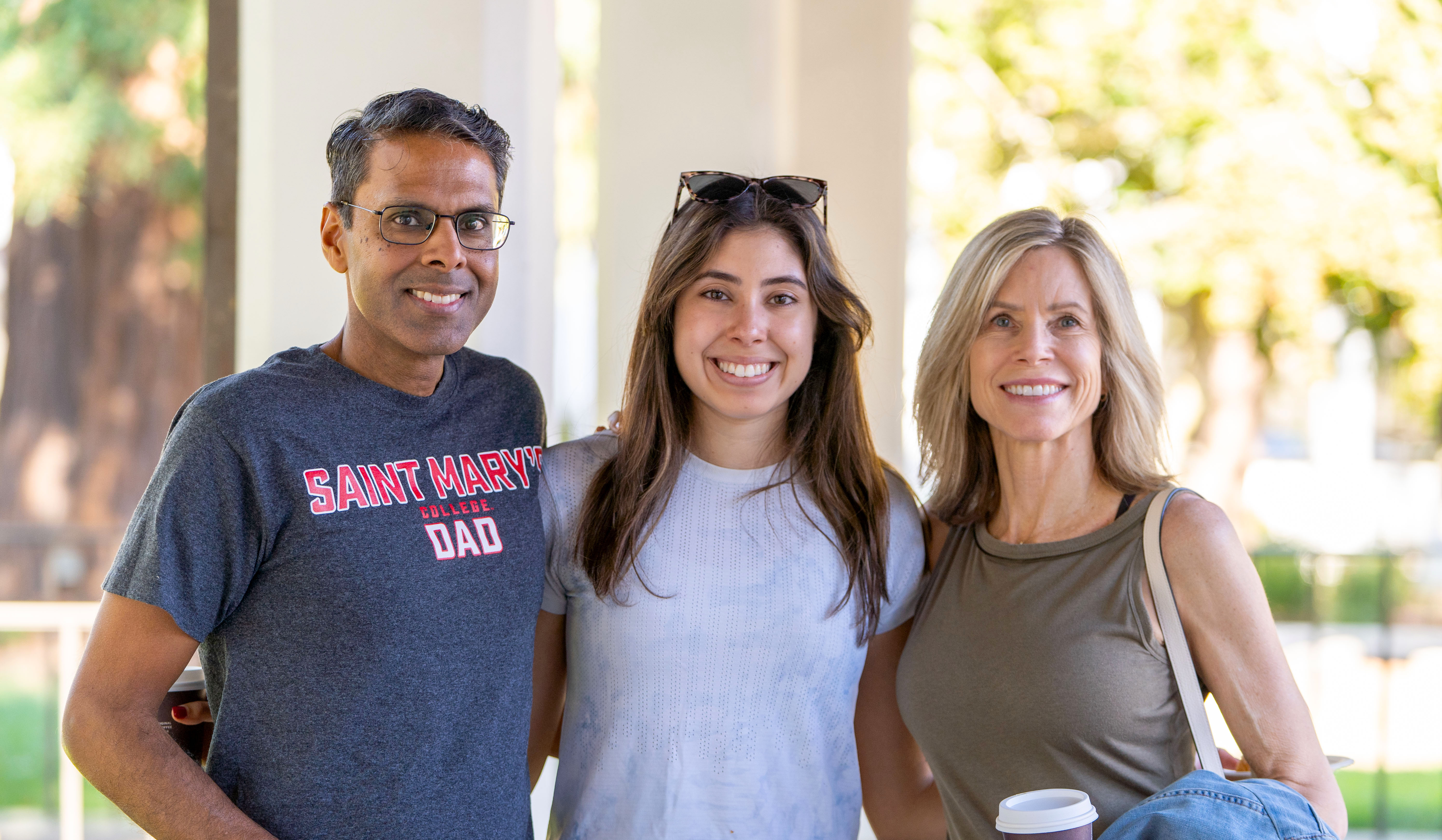 Students and families reunited for a full weekend of experiencing all Saint Mary's has to offer. Sonia Lakshmanan '27 and her parents, Hari and Janet, smile for a portrait between breakfast and their first session of the day. / Photo by Bryan Navarro