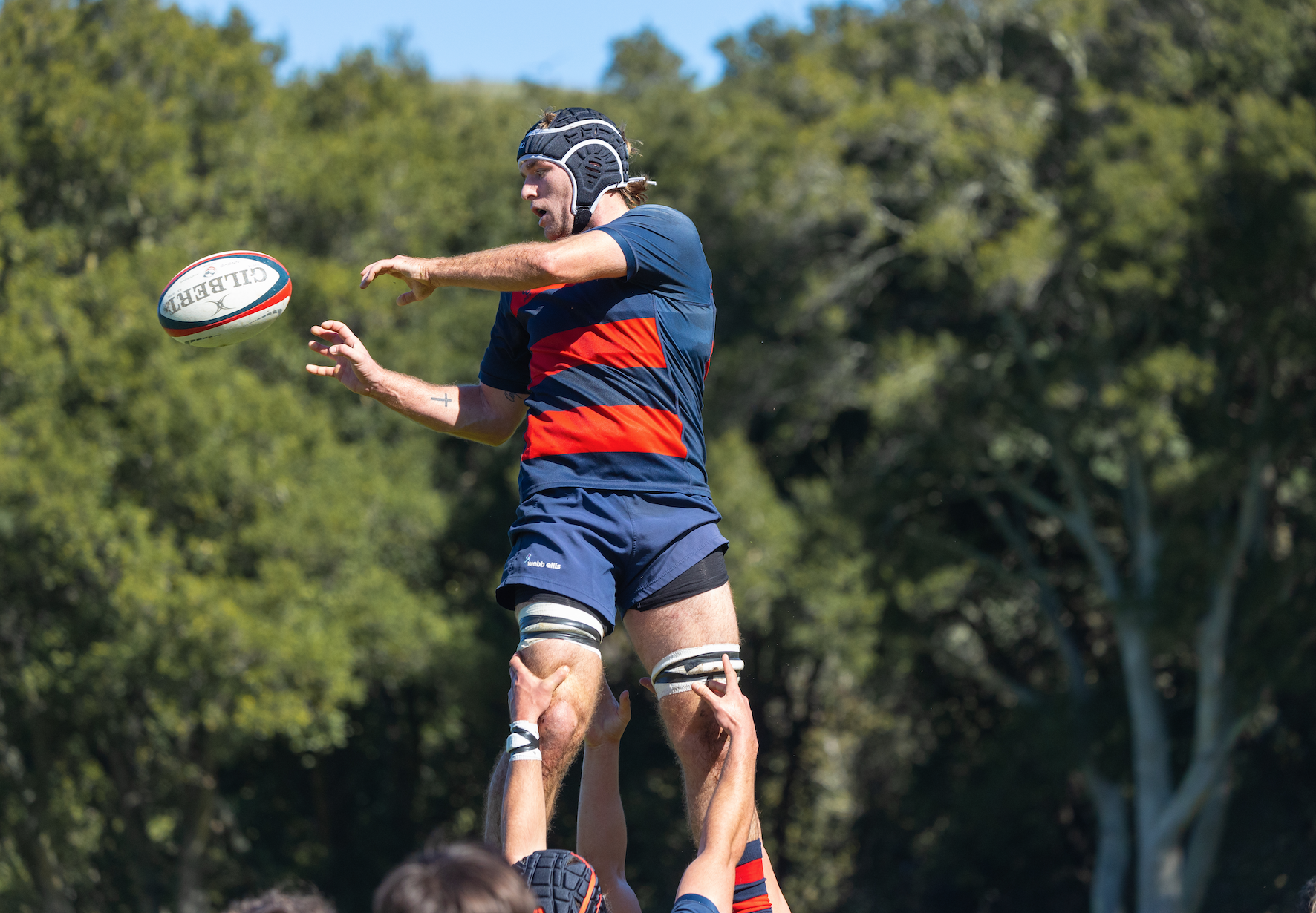 Captain Cathal Coakley ’24, MA ’25 receives the ball from a lineout and passes to his teammates below during the Men's Rugby game against Santa Clara. / Photo by Rebecca Harper
