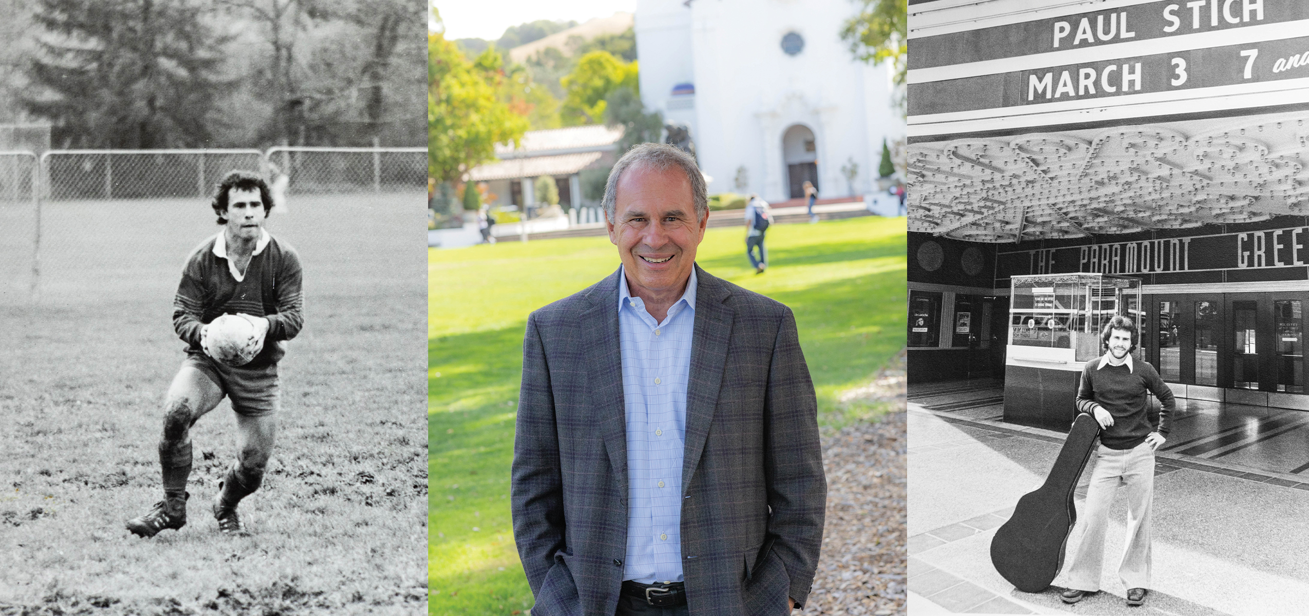 How he plays: Paul Stich ’79, who was awarded the 2024 Patrick B. Vincent Lifetime Achievement Award—on the rugby pitch (left) and sharing his musical talent as a Saint Mary’s College student (right). / Images courtesy Stich Family