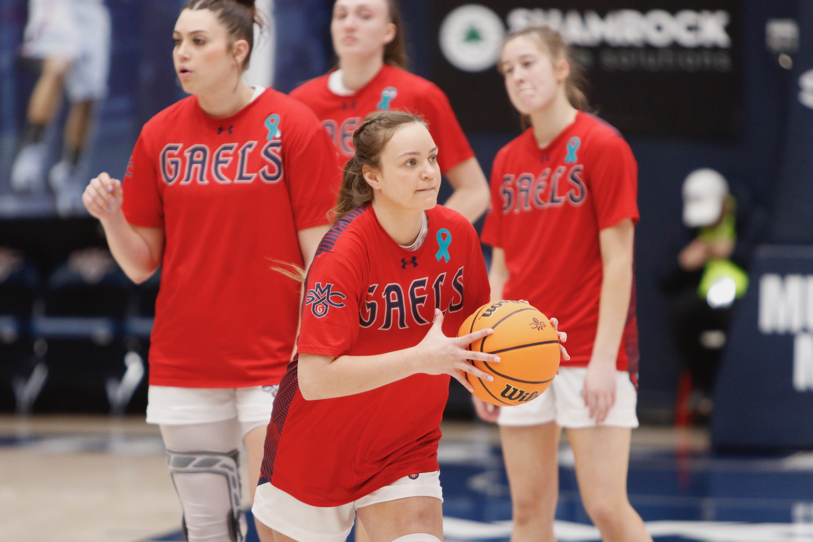 Saint Mary’s men’s basketball players wore pins on their warm-up shirts as well, and the swath of teal that occupied a student section usually dominated by red, white, and blue stood out as the Gaels rolled to a win over the Pilots.