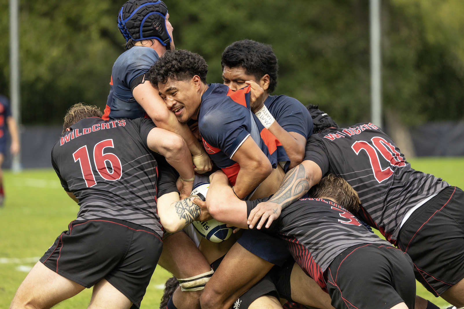 The physicality of the Men's Rugby match against Central Washington put the Gaels to the test. Siale Ofa ’28 is supported by King Matu ’24, MA ’25 on the right and Matthew Abbes ’26 on the left, challenging the Wildcats was they push forward on the field. / Photo by Rebecca Harper