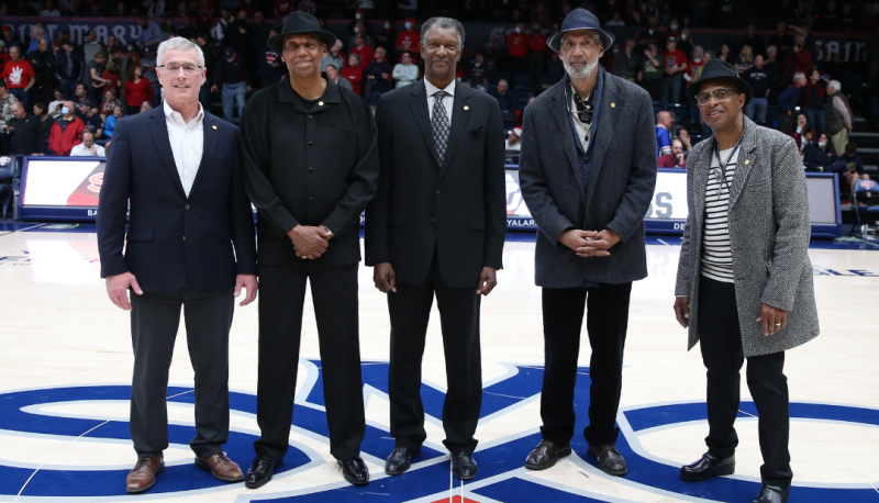 On the 50th anniversary of the basketball walkout, the Office of the President; Office of Inclusion and Belonging; and the Athletics Department recognized the five former basketball players for their bravery and sacrifice during halftime of the men’s basketball game against Gonzaga.