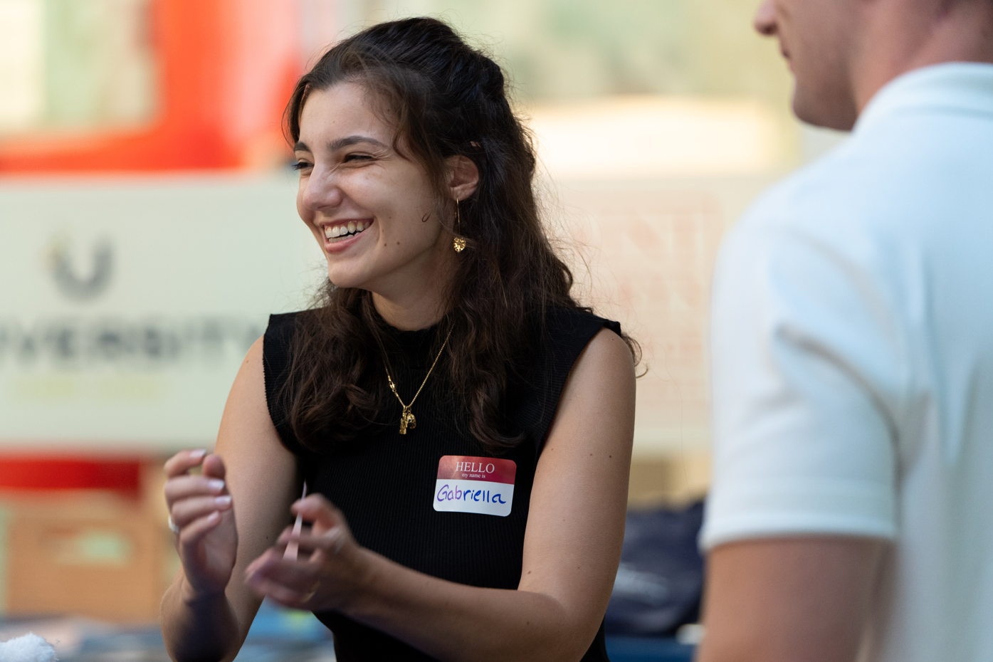 A connection is made: Gabriella Thomas '23, MFA '25 at a Young Alumni Networking event on August 7, 2024. Events like this are all part of the robust support the Career Center provides, says executive director Mary Beth Stadt. "It's a critical part of the Saint Mary's experience." / Photo by Bryan Navarro