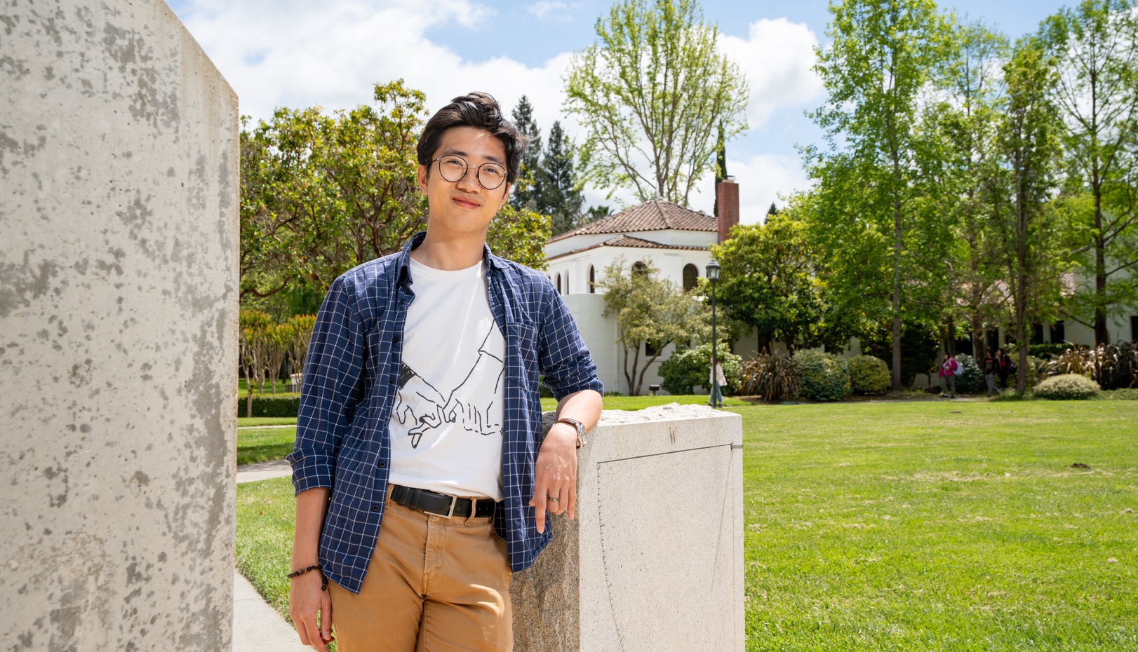 On time: Integral major Richard Trinh '24 leans on SMC’s gnomon, a reconstruction of an ancient Greek sundial used by students in the Integral Program, which is grounded in primary texts to explore science, mathematics, music, the arts, and more. / Photo by Francis Tatem