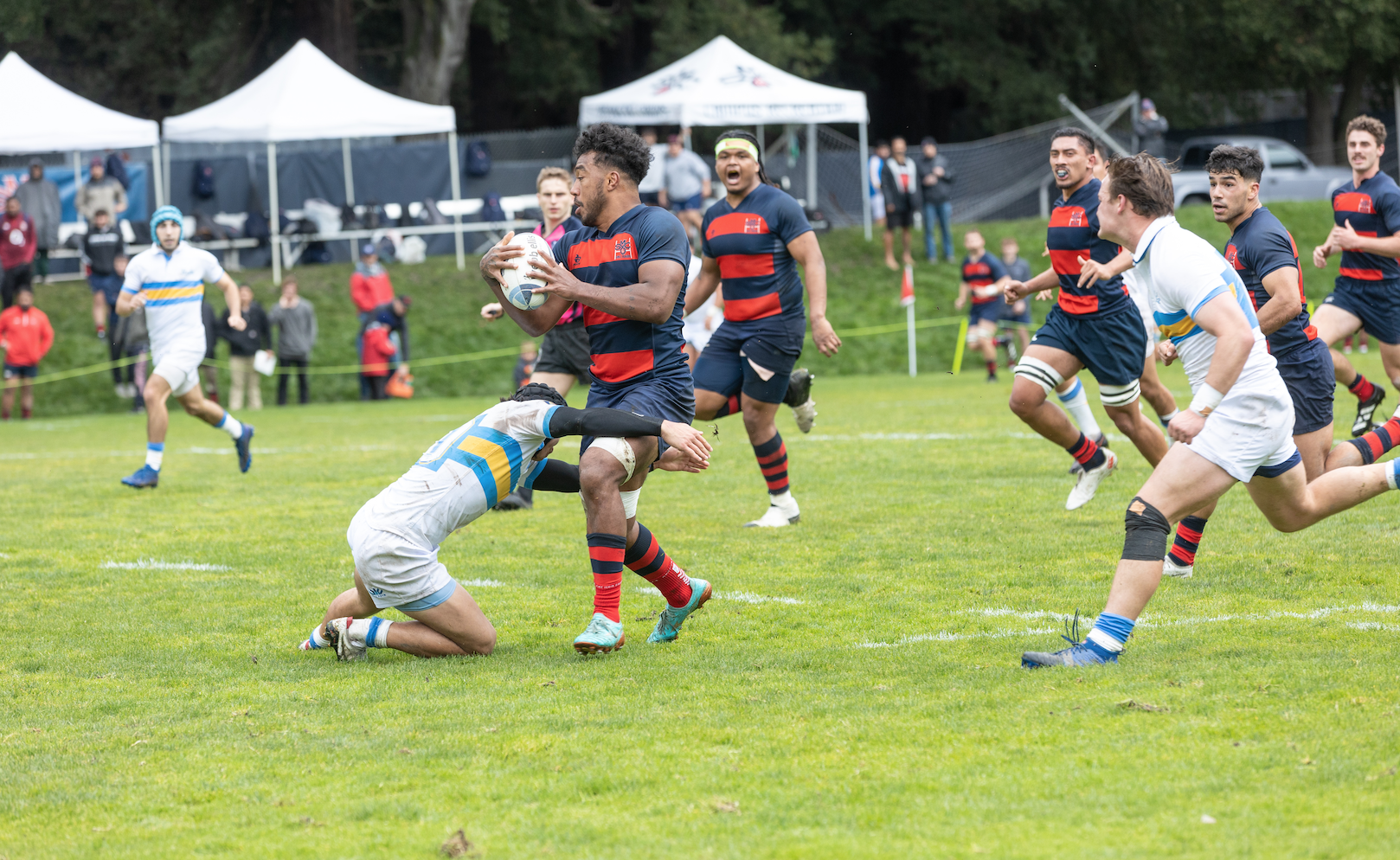 During the B-side match-up, both teams showed tremendous effort and performed especially well for the rainy weather. Saint Mary]s center Tristan McAlister ’24 played a blinder of a game, scoring the first try of the game and many more throughout the match. His aggression on offense had the UCLA defense on their heels after he put his shoulder down only a few times.