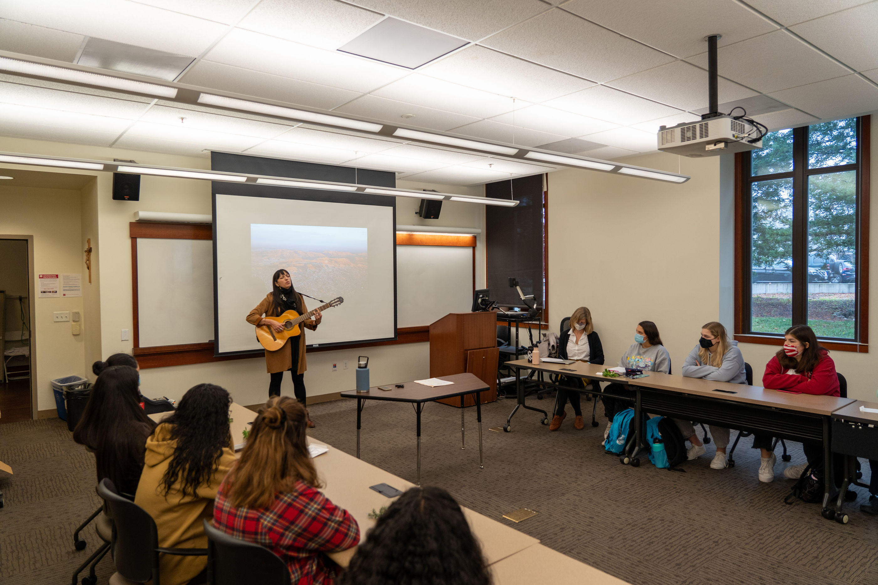 In JCL 10, the introductory class in SMC's Justice, Community & Leadership Program, Professor Suzanne Schmidt typically sets aside her final class session for a celebration of collective learning. The materials covered in JCL 10 are challenging, as students are asked to consider their own and each other's perspectives, life experience and positionality in relation to topics such as race, class, gender, ableism, immigrant rights, and inequality in the U.S. education system. In pre-COVID times, students would typically celebrate the end of the semester over food and drinks. This semester, Schmidt invited local musician and activist Diana Gameros to give a private concert and guest lecture for their final class session.
