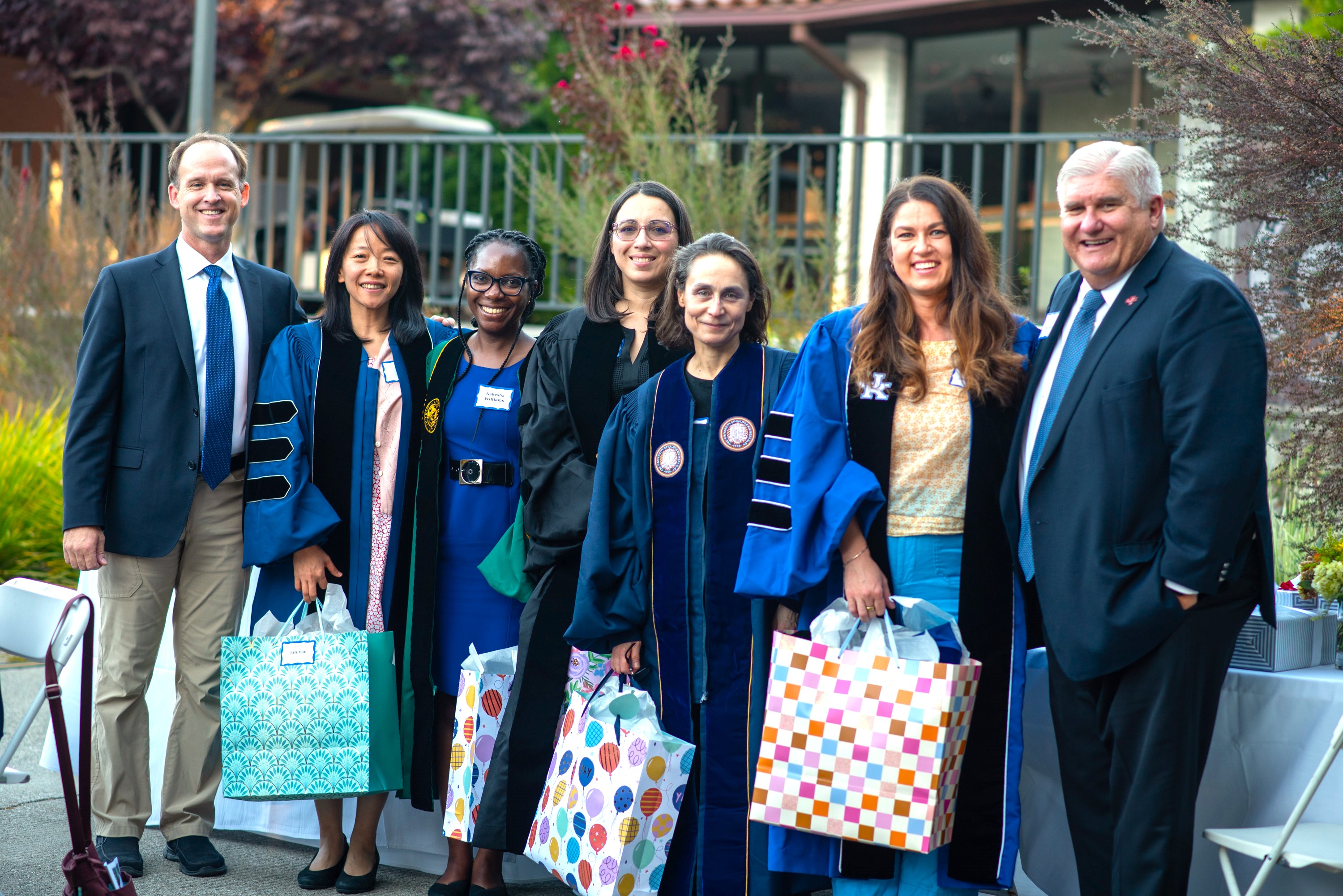 Smiles all around: Saint Mary’s newly tenured faculty are acknowledged and celebrated. From left: Provost and Executive Vice President Corey Cook, Lili Yan, Nekesha Williams, Elizabeth Valentin, Michal Strahilevitz, Anna Maximova, and President Roger Thompson. Not pictured: Yin Yuan. / Photo by Sofia Mastroianni