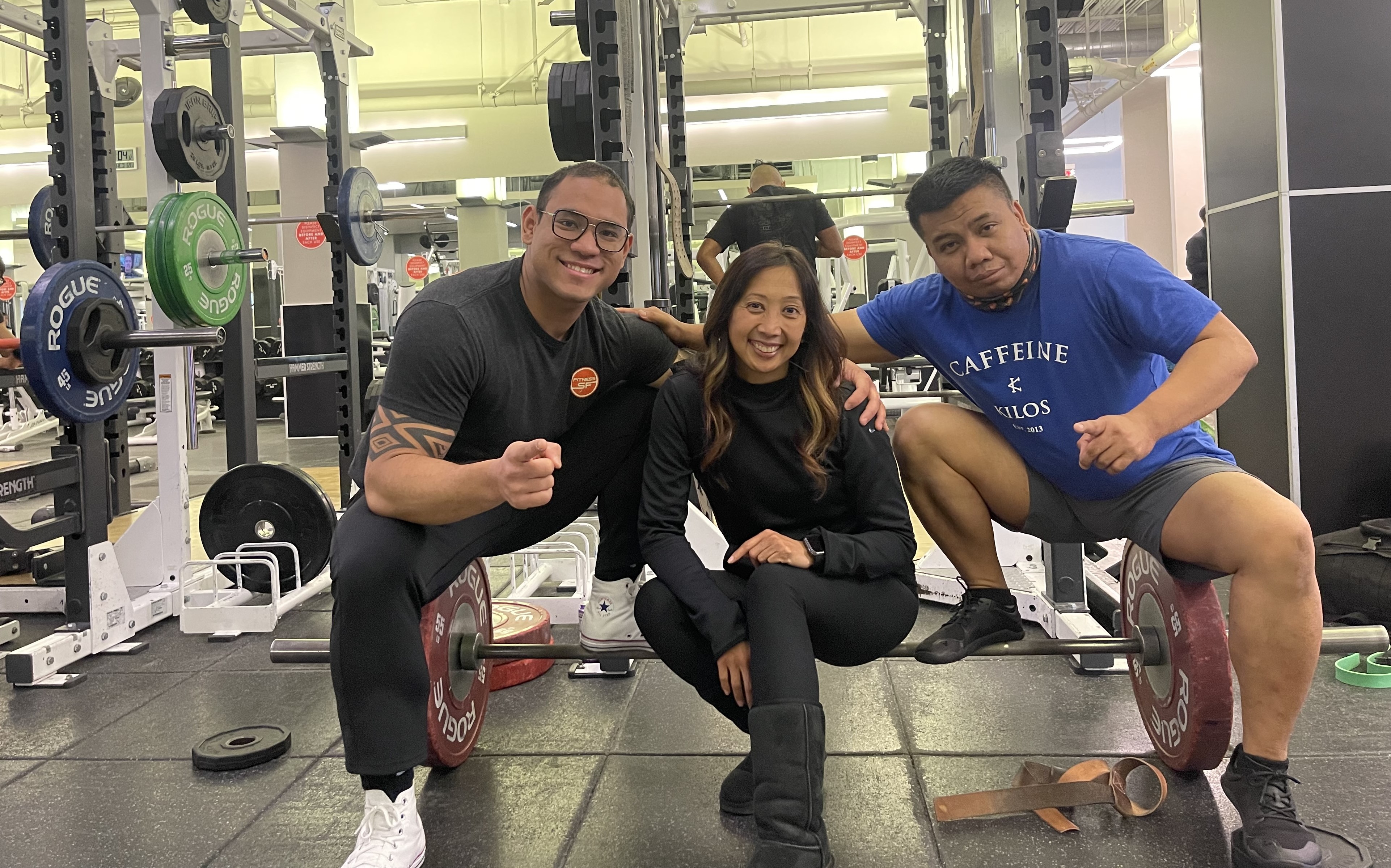 Fit for duty: Saint Mary's graduate student Josh McClendon ’21, MA ’24, left, with friends Annebelle and Ryan, all with FitnessSF Mid-Market in San Francisco. McClendon is an experienced personal trainer and a First Lieutenant in the Army Reserve. He’ll add to his fitness credentials when he receives his MA in Kinesiology at Saint Mary's in May. / Photo courtesy Josh McClendon