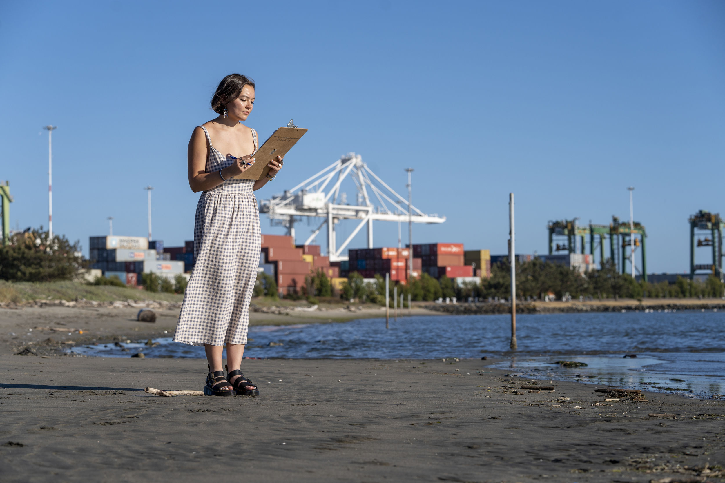 In the Field: Desiree Sturrock ’25 at the Port of Oakland, the fourth largest port on the West Coast / Photo by Francis Tatem