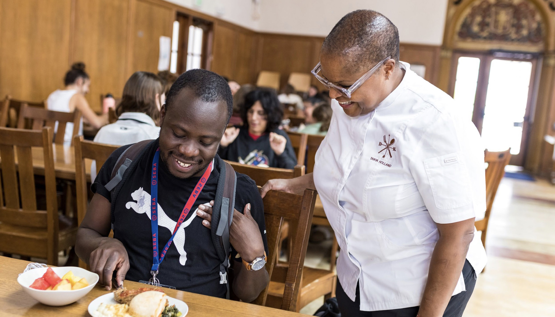 Good eats: Guest chef Tanya Holland and Brian Muganda MBA ’24, a graduate student in the School of Economics and Business Administration / Photo by Nicole Sepulveda for SMC