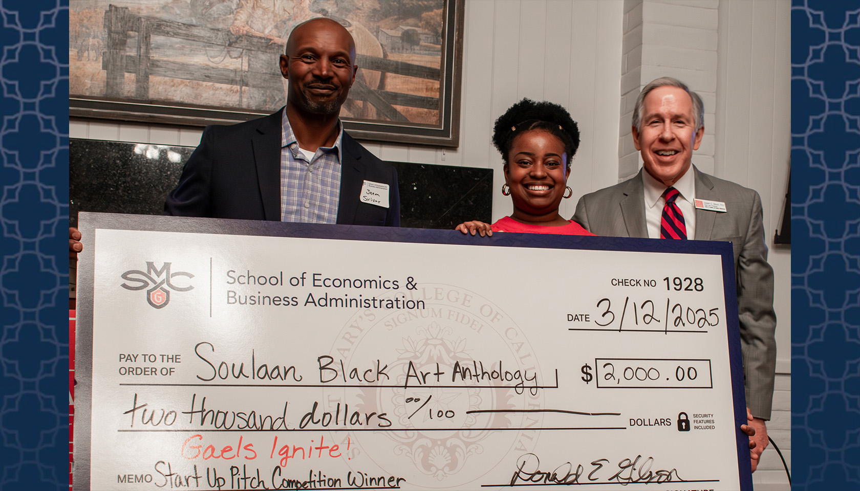 Gaels Ignite Winner: Kaila Harris ’25, center, holds her winning check for her idea for Soulaan, a Black Art Anthology portal. On the left is Professor Jeem Sirivar, Faculty Lead for the event, and on her right Donald Gibson, Dean of the School of Economics & Business Administration. / Photo by Dan Avina