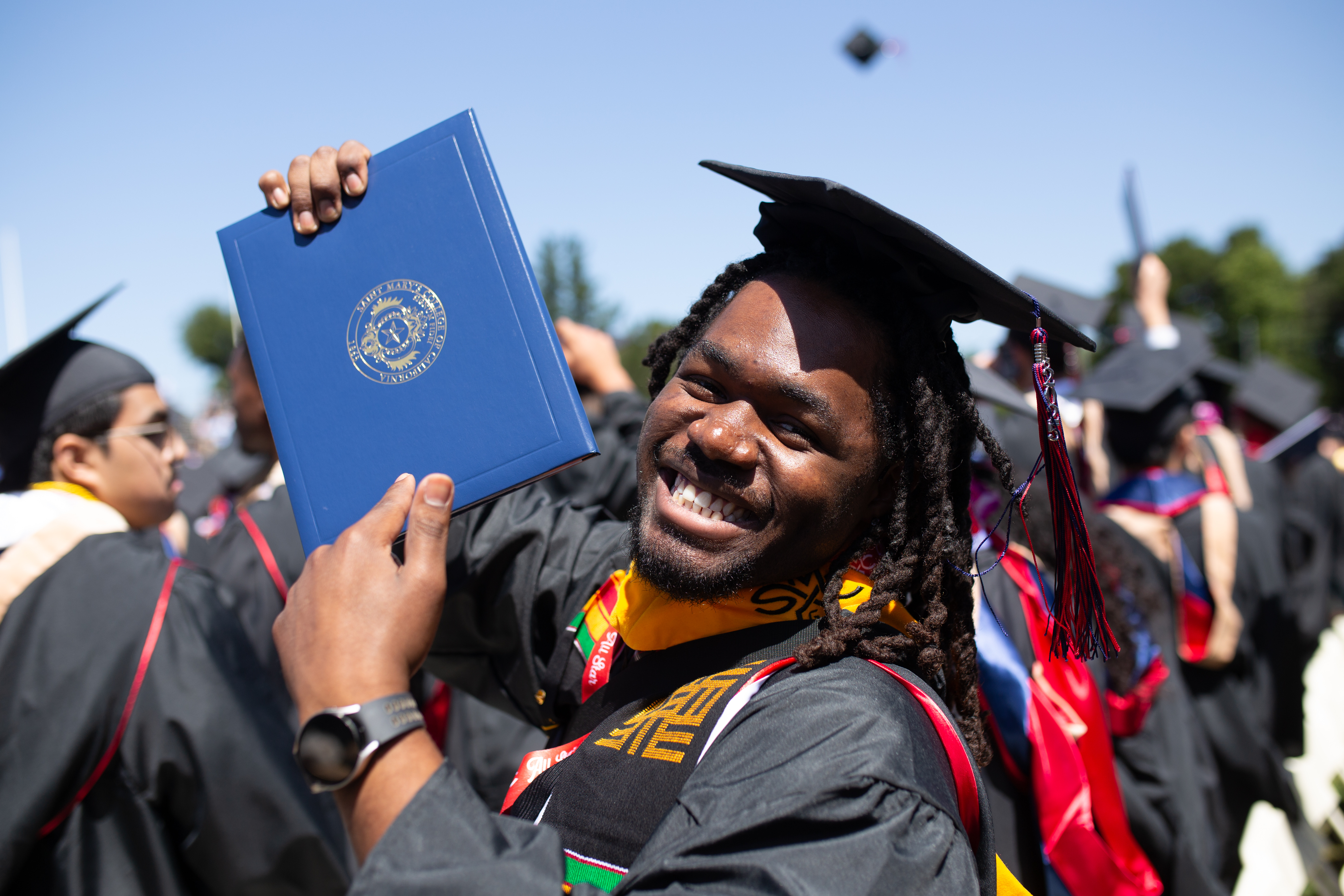 Bright futures incoming: David Coleman ’25 shows off his hard-earned degree. For Coleman, that’s one with a double major in Computer Science and Data Science. / Photo by Richard Trinh