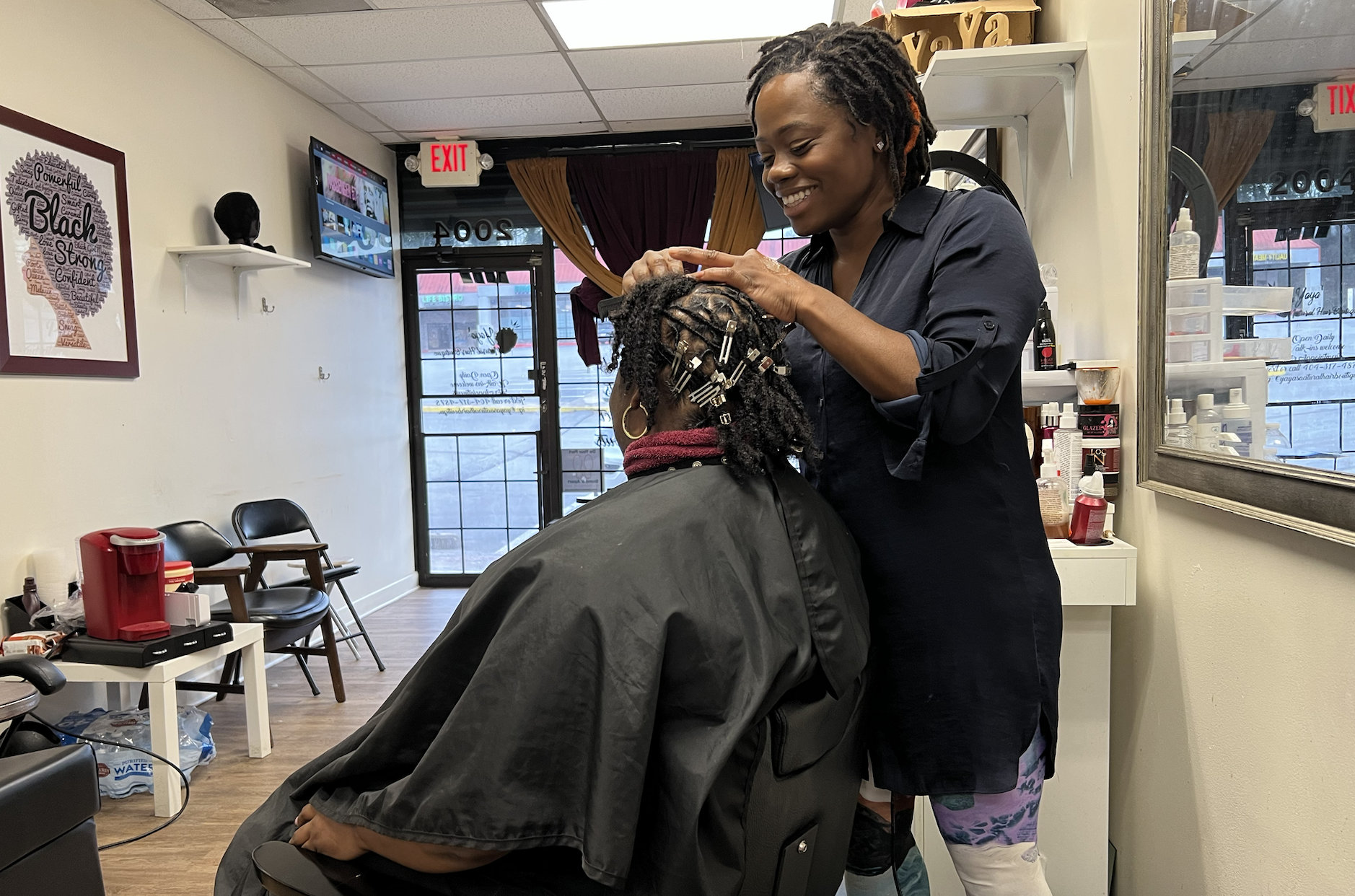 ABOVE: Yakini Horn, owner of Yaya’s Natural Hair Boutique in Atlanta, rolled sections of Akeyla Peele-Tembong’s hair in her hands during a styling visit on Feb. 20, 2023. Horn was creating “starter locs,” the early stage of a natural hairstyle that will take months to root. Photo by Victoria St. Martin