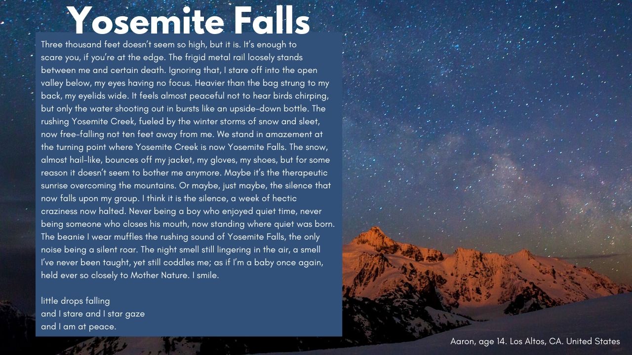 In this 2020 interview with River of Words, Aaron talks about singular moments becoming the biggest inspirations in his writing process and how a field trip left him wanting to express feelings, which led to his poem "Yosemite Falls."