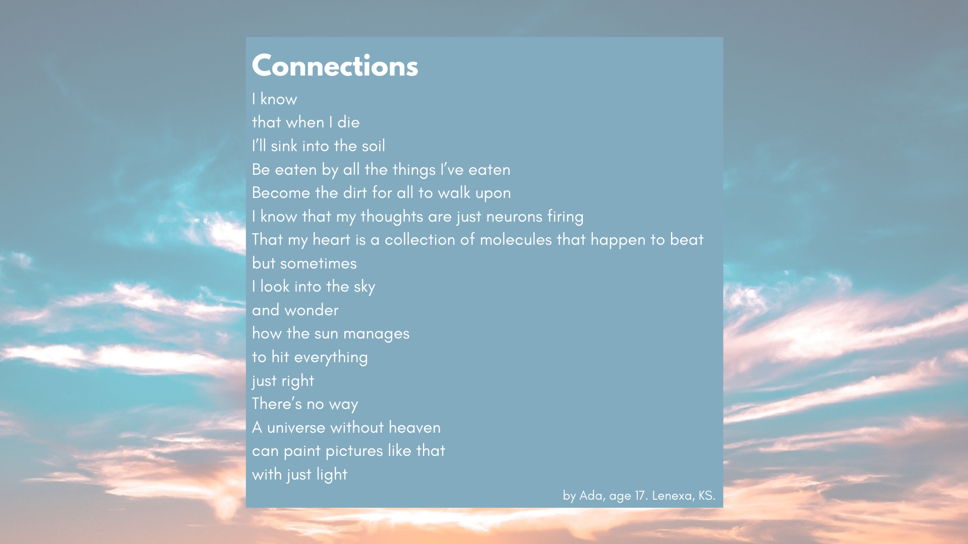 Q: Let’s talk about your piece “Connections.” It’s a little bit about the natural world and a little bit about being human. What inspired you to write it?
