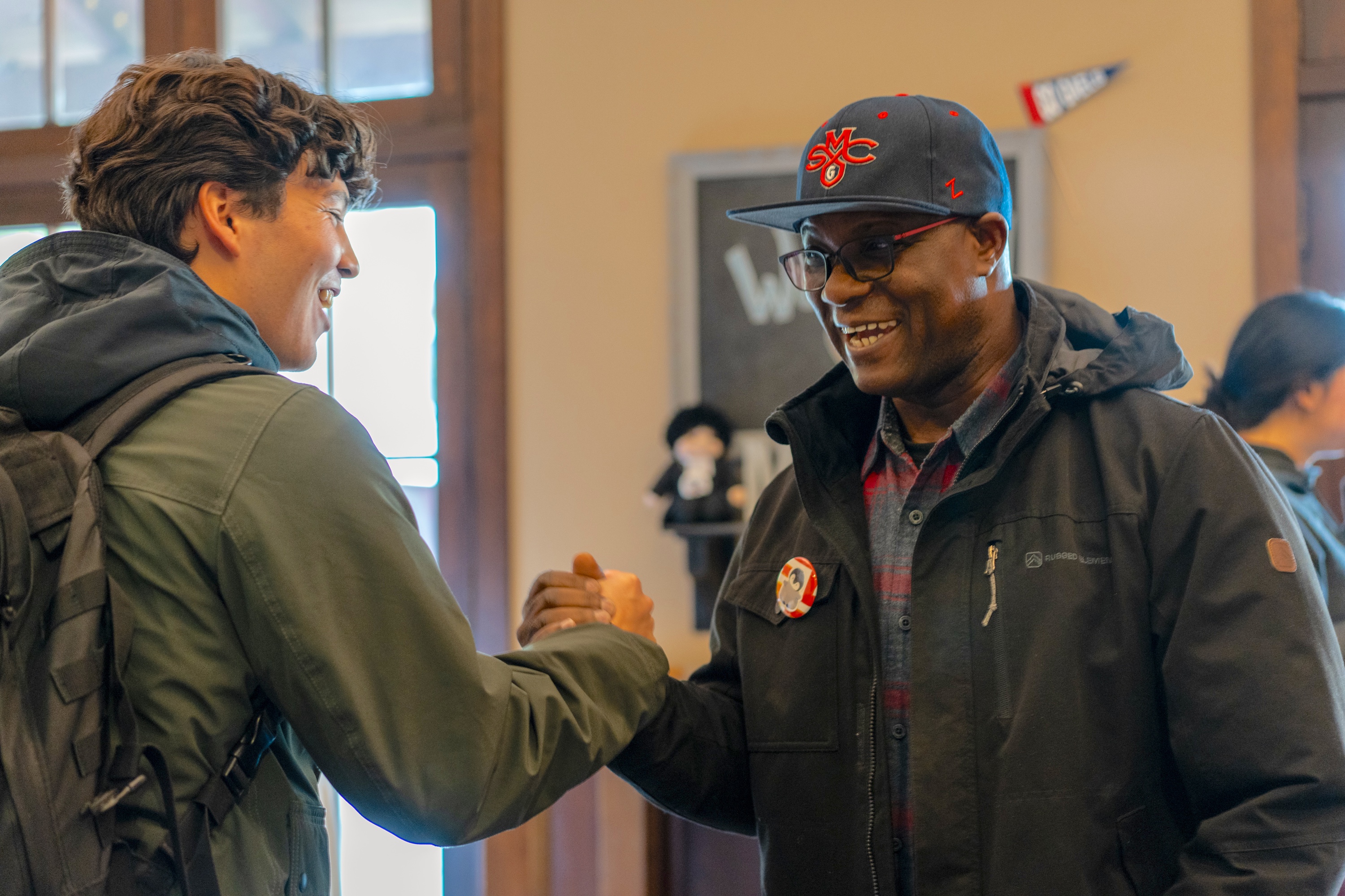 A mission of connection: Father Kwame Assenyoh, the College's new Chaplain, at a recent meet-and-greet on campus. Father Kwame was drawn to SMC because of the College's core Lasallian values, he says. “They’re solid, and we can all find ourselves in them.” / Photo by Francis Tatem