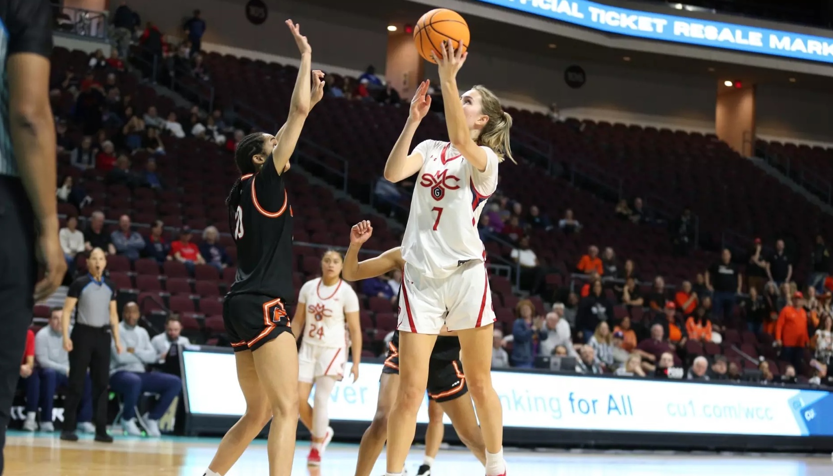 Career-high moment: First-year forward Edie Clarke had her best night all season, recording 14 points and nine rebounds off the bench. / Photo by Tod Fierner for SMC Athletics